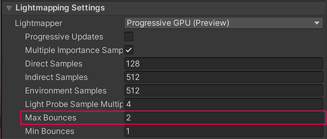 2. Set the Max Bounces property to 4. This increase will include more bounces in the calculations for the scene’s baked indirect lighting without lengthening the bake times too much.