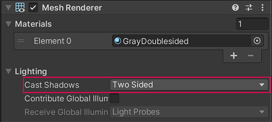 This means that the environment GameObjects will cast shadow from either side of their GameObject meshes, which will make it look more realistic — not using this setting can cause issues with shadows displaying correctly if you use single-sided shapes like planes to stand in for more complex meshes when constructing an environment.