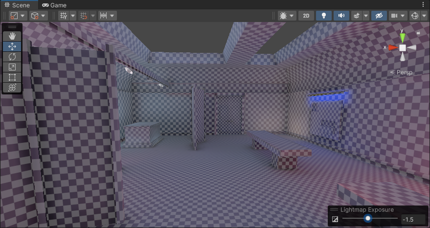 The Baked Lightmap Draw Mode view displays baked lightmaps applied to the scene geometry (meshes) as a checkered overlay. This diagnostic view can help you identify issues with models. You can use the Lighting Exposure control to make it easier to see the checkerboard effect in the scene.