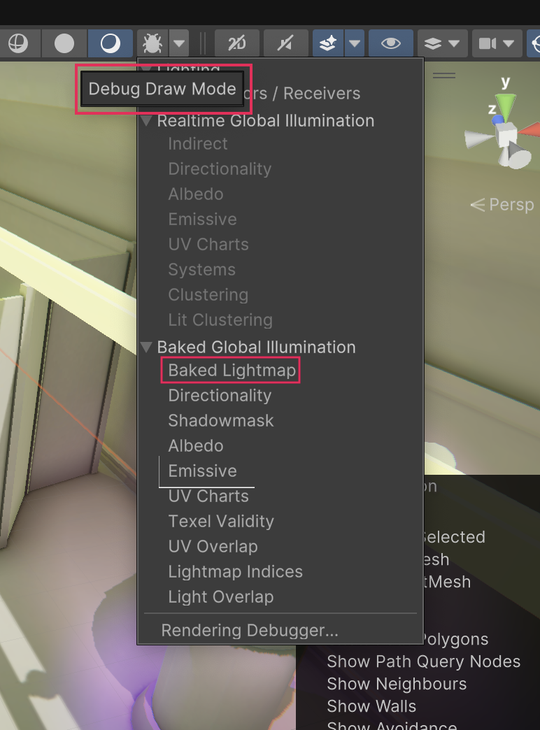 1. In the Scene view control bar, use the Debug Draw Mode dropdown (top middle) to select Baked Lightmap.