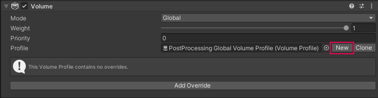 1. Select the Postprocessing Global Volume object in the Hierarchy, then in the Volume component, select New to create a new profile.