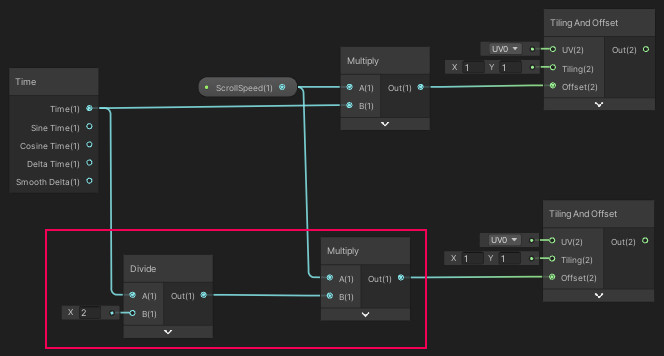5. Set the value of the Divide node to 2 using the B input to divide the ScrollSpeed by two.
