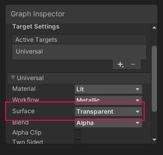 6. In the Graph Inspector, on the Graph Settings tab, change the Surface type of this shader to Transparent. This is the same setting you saw in the materials for the URP/Lit Shader.