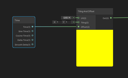 5. In this case, you are changing the Offset value to simulate a scrolling effect on the shader. Drag the Time output of the Time node to the Offset input on the Tiling and Offset node.