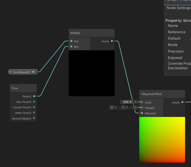 5. Connect the outputs of the Time and ScrollSpeed nodes into the Multiply node inputs.