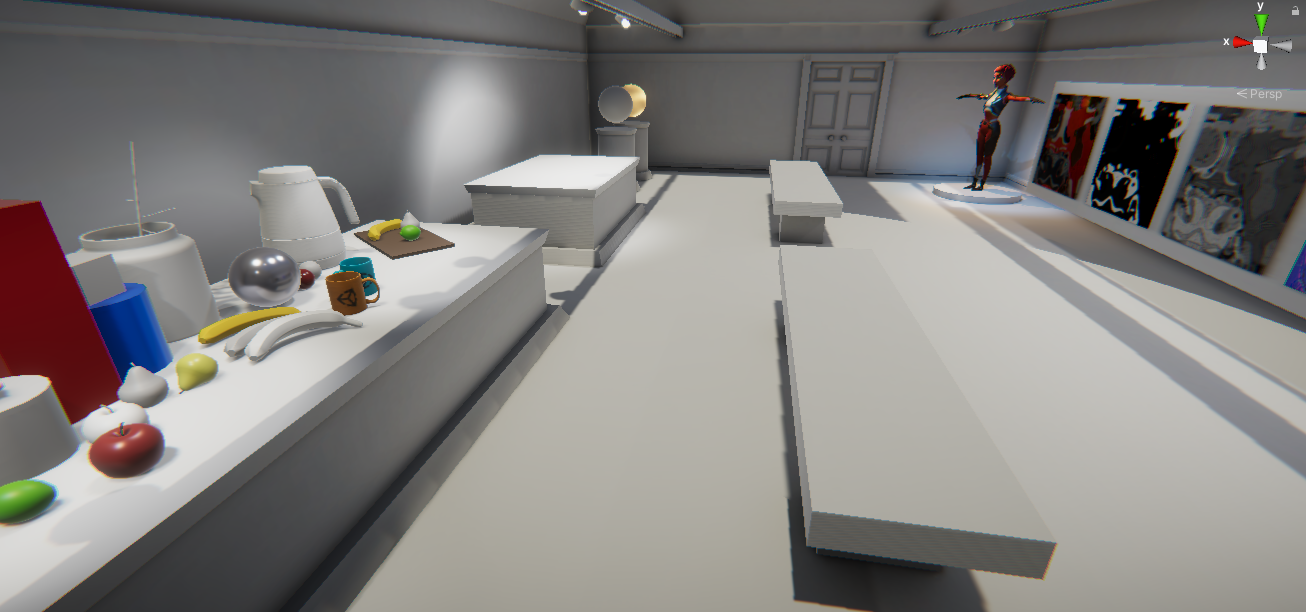 7. In the Hierarchy, select the Banana GameObject. Double-click it in the Hierarchy, or select the Scene view and press the F key to orient your view inside the gallery.
