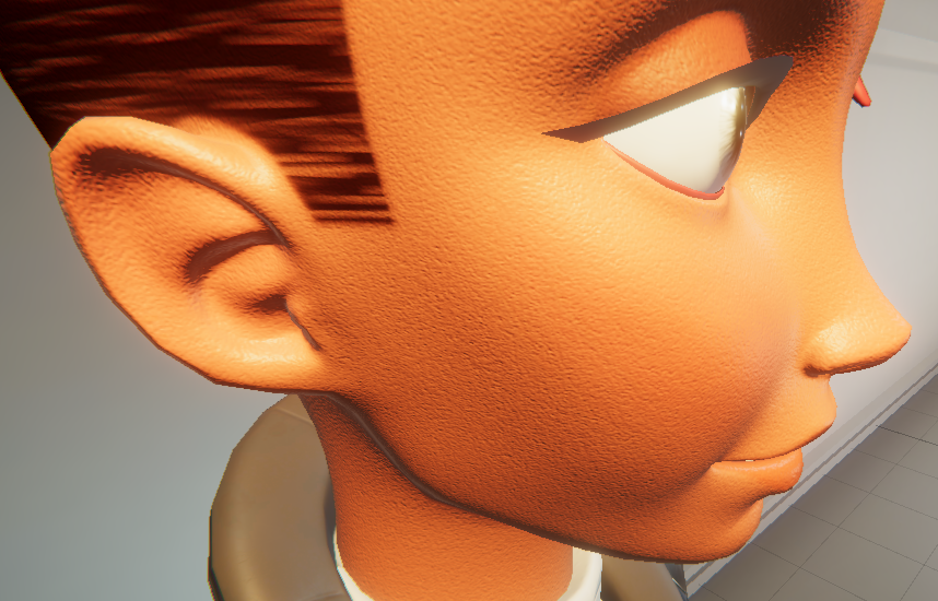 Without the occlusion map, there is no shadow on either side of Ellen’s collar, which makes that area look flat. In fact, without the occlusion map, it looks like there is light coming from behind her neck at close range. With the additional shadows, the collar looks rounder and the shadow gives the appearance that her collar and vest are two different objects (even though on this model they are one).