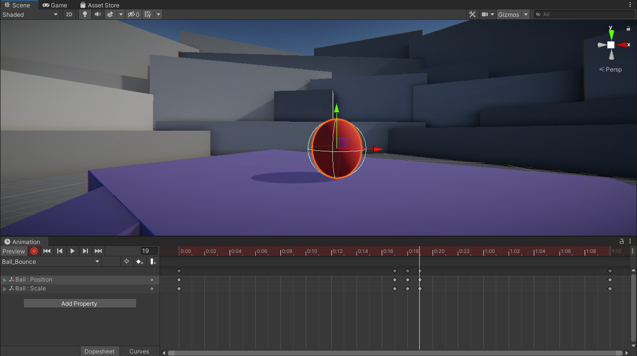 3. Preview the animation by pressing play in the Animation editor. The sphere will now squash and stretch as it hits and bounces back up into the air.