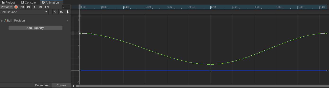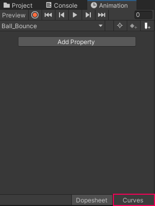 In cases like the bounce animation, an animator must modify the tweens themselves, and in Unity this is done through the Curves editor. Until this point you have been working in a section of the Animation editor called the Dopesheet, which is where all keyframes are set.