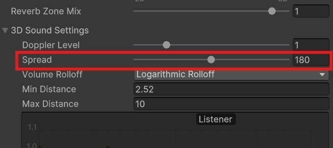 Notice how the audio becomes evenly balanced in both speakers. A Spread setting of 180 removes the positional relationship between the speakers and the audio source, leaving only the volume to change based on the player character’s distance.