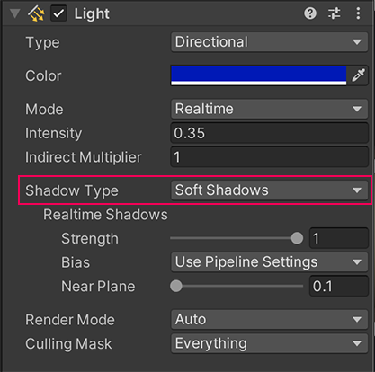 Now that you’ve considered the pipeline asset, you can enable Soft Shadows in the Directional Light: