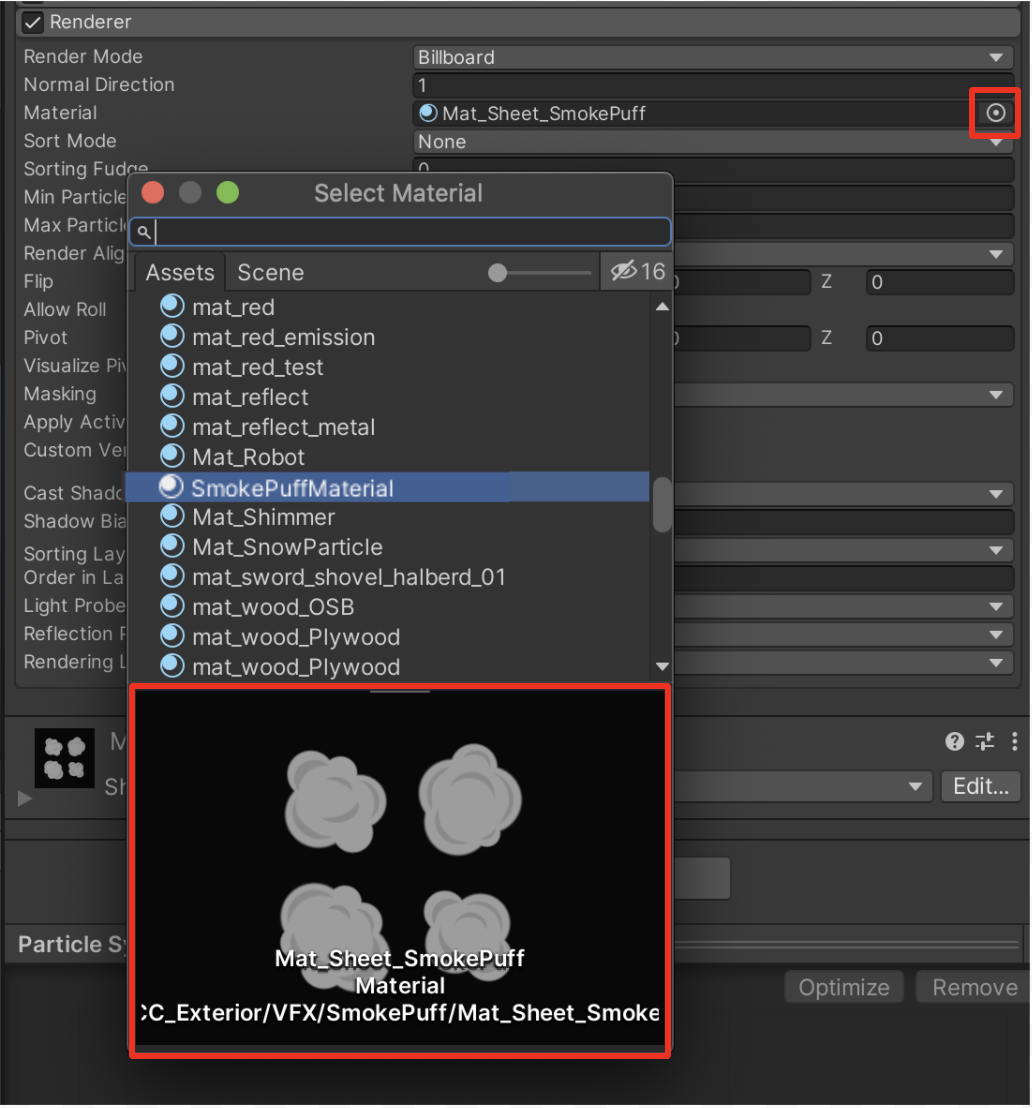 1. Expand the Renderer component, then for the Material property, use the object picker to choose the texture sheet material (named SmokePuffMaterial).