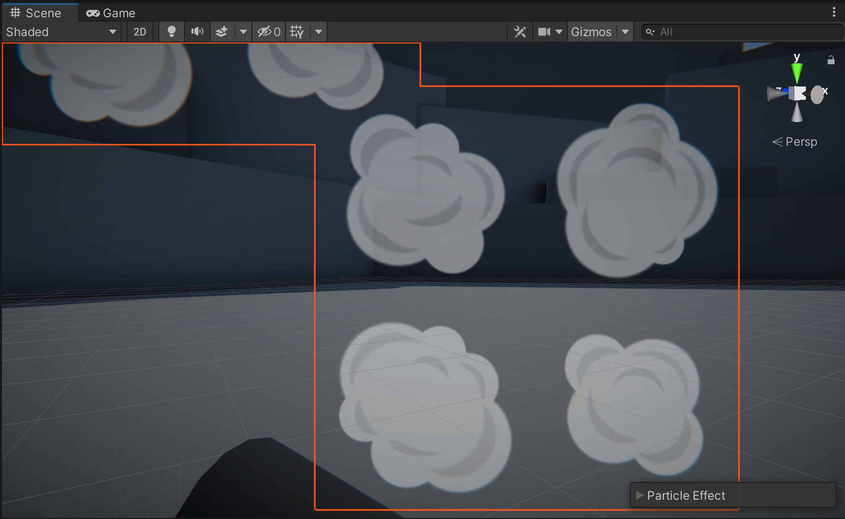 First, let’s configure our scene’s starting state correctly, with the fire effect playing and the smoke burst not playing.