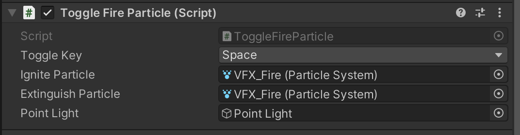 4. In the ToggleFireParticle component, you can select a different key to use for user input. You can assign one particle to ignite the fire and another to extinguish it. You can also assign the point light attached to the fire, which will go on and off with the fire as well.
