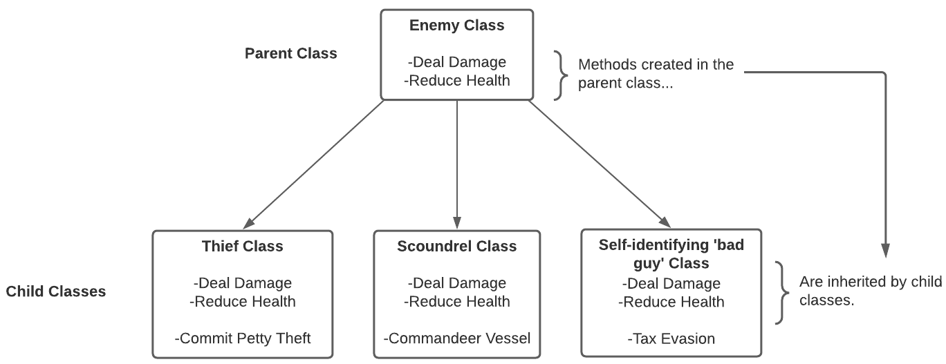 }In the above example, the Enemy class has a DealDamage method that removes 10 points from the Player’s health whenever it’s called. The Thief class, a child of Enemy, can call this method without declaring it in the class.