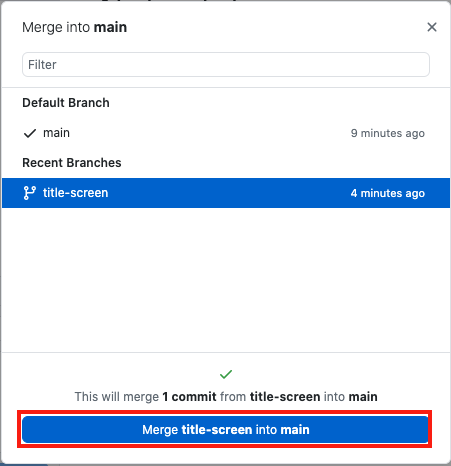 With your title screen (or other feature) complete, you are now ready to merge your experimental branch into the main development branch.