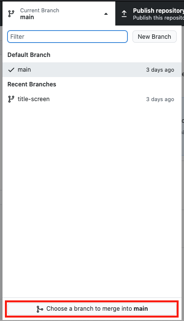 2. From the branch drop-down, select Choose a branch to merge into main. Then, select your other branch and select Merge [branch-name] into main.