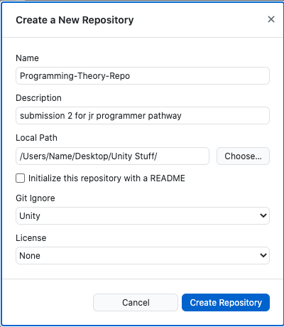 1. Create a new repo configured for Unity named something like “Programming-Theory-Repo.”