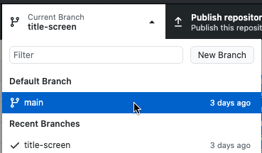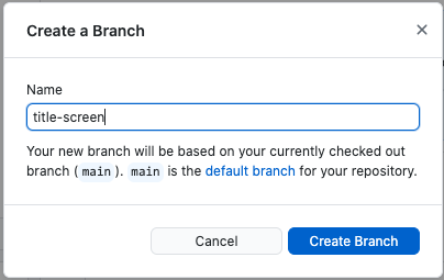1. Create a new branch in your repo and name it something like “title-screen.” If you are not sure how to create a new branch, follow the instructions in the GitHub documentation. On this branch, you will be able to safely experiment with your new feature without interfering with any other developer’s work.