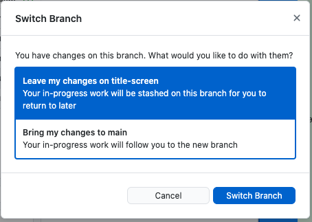 If you’ve made changes since your last commit, you may be prompted to choose whether you want to “Leave changes” on the branch or “Bring changes” over to the main branch. This means that you have changes to your branch that have not yet been committed. Cancel, make sure that all changes are committed on your branch, and try switching to the main branch again.