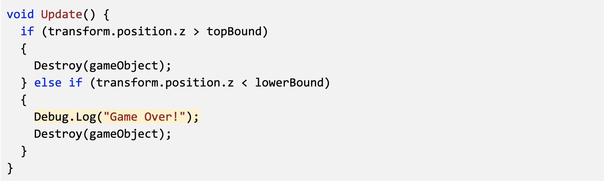 - In DestroyOutOfBounds.cs, in the else-if condition that checks if the animals reach the bottom of the screen, add a Game Over messsage: