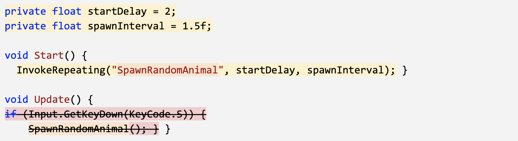 - In Start(), use InvokeRepeating to spawn the animals based on an interval, then test.
