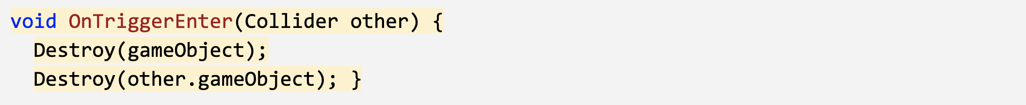 - In OnTriggerEnter, put Destroy(other.gameObject);