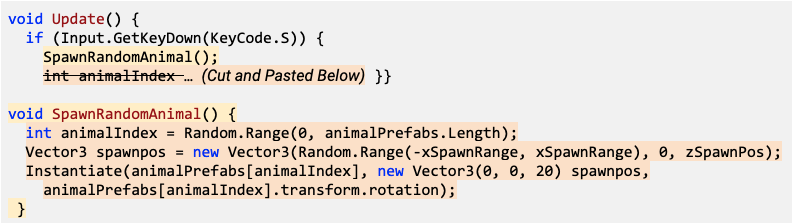 - In SpawnManager.cs, create a new void SpawnRandomAnimal() {} function beneath Update()