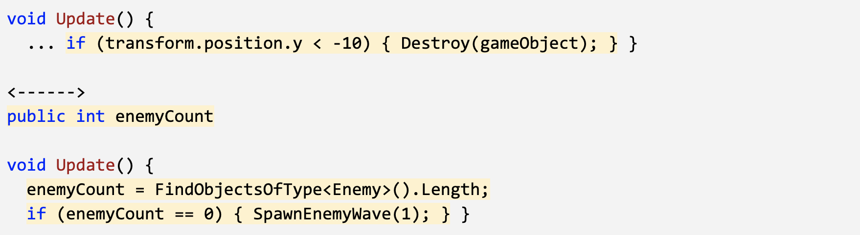 - In Update(), set enemyCount = FindObjectsOfType<Enemy>().Length;