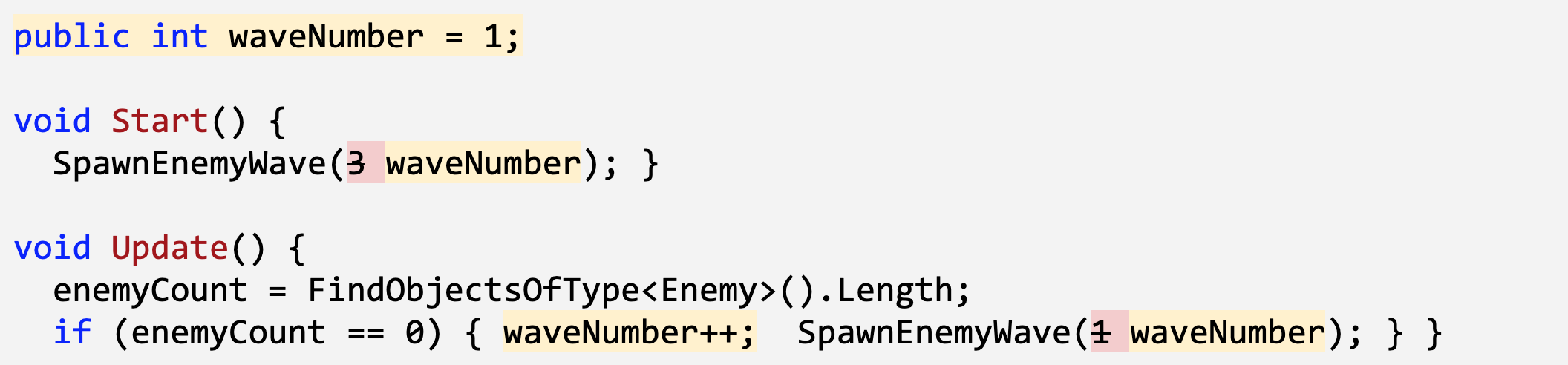 - Declare a new public int waveNumber = 1;, then implement it in SpawnEnemyWave(waveNumber);