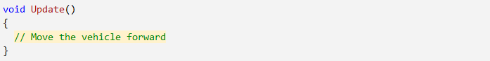 - In the Update() method, add a comment that you will: // Move the vehicle forward