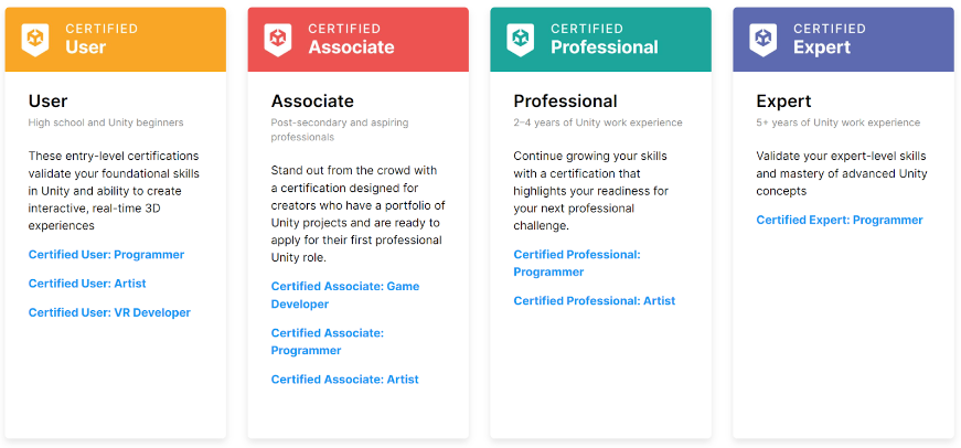 Unity offers certifications across four difficulty levels and specialization tracks, focusing on programming and artist roles.