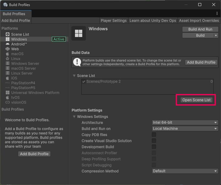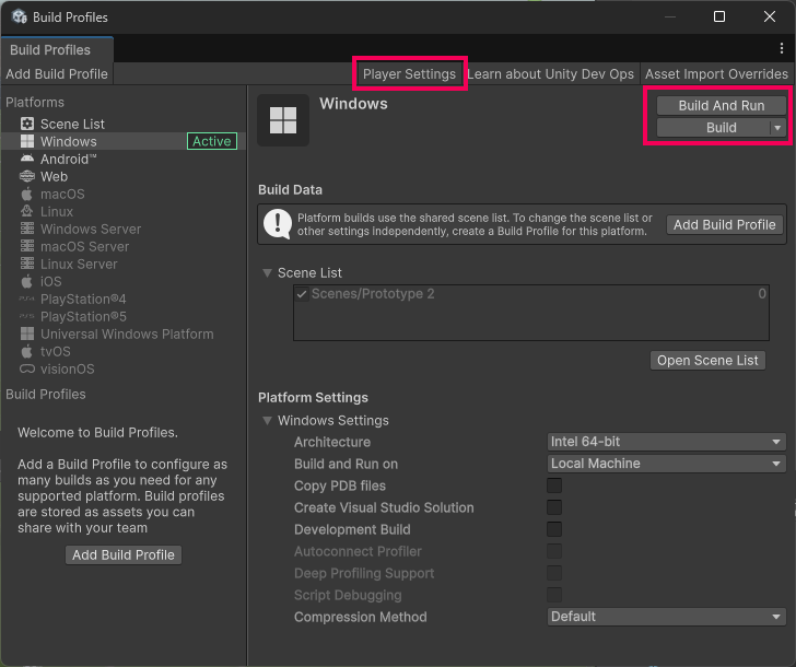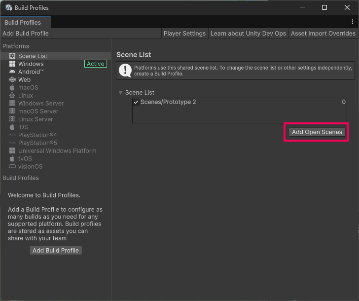 2. In Unity, click File > Build Profiles, then click Select Windows or macOS as your target platform, then select Switch Platform. If a window pop up that say the Unity Editor needs to be restarted select Apply.