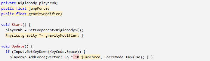 - Add a new public float gravityModifier variable and in Start(), add Physics.gravity *= gravityModifier;
