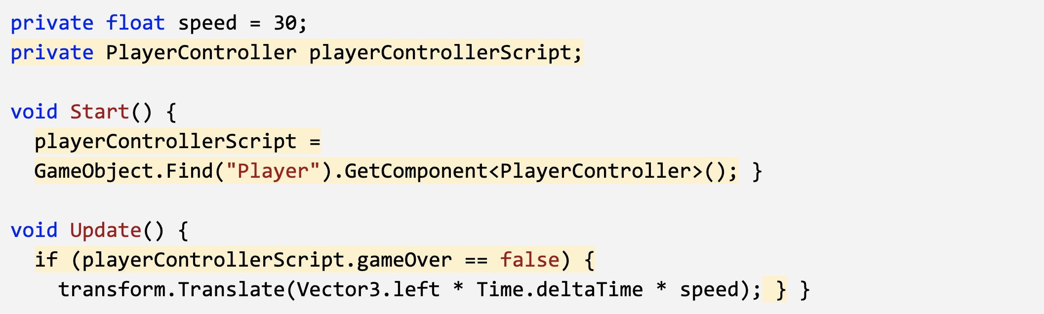 - In MoveLeft.cs, declare a new private PlayerController playerControllerScript;