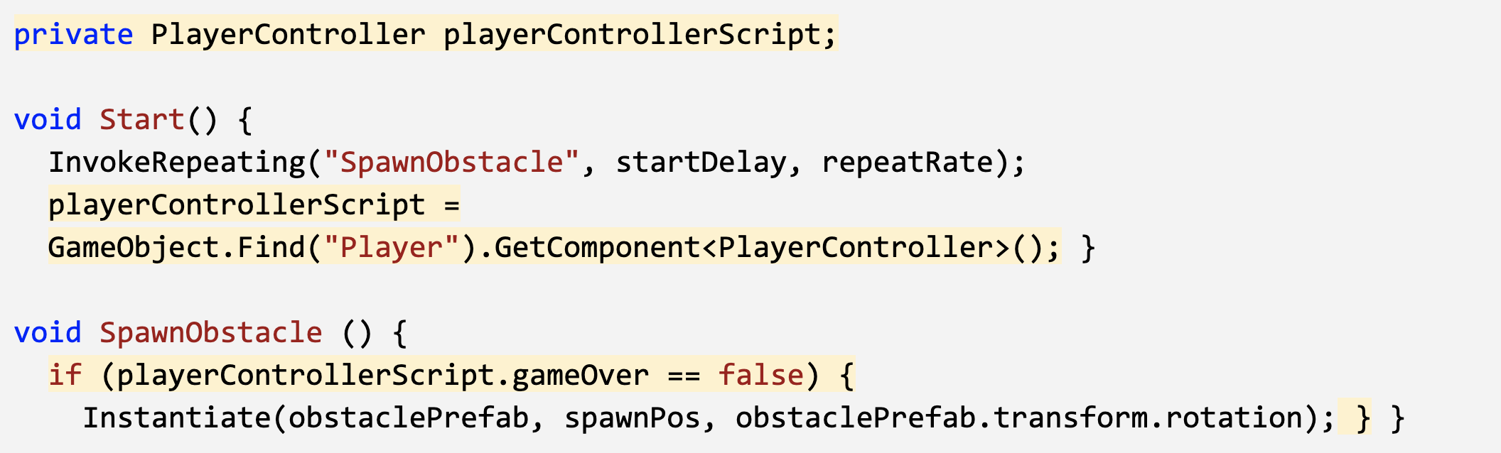 - In SpawnManager.cs, get a reference to the playerControllerScript using the same technique you did in MoveLeft.cs