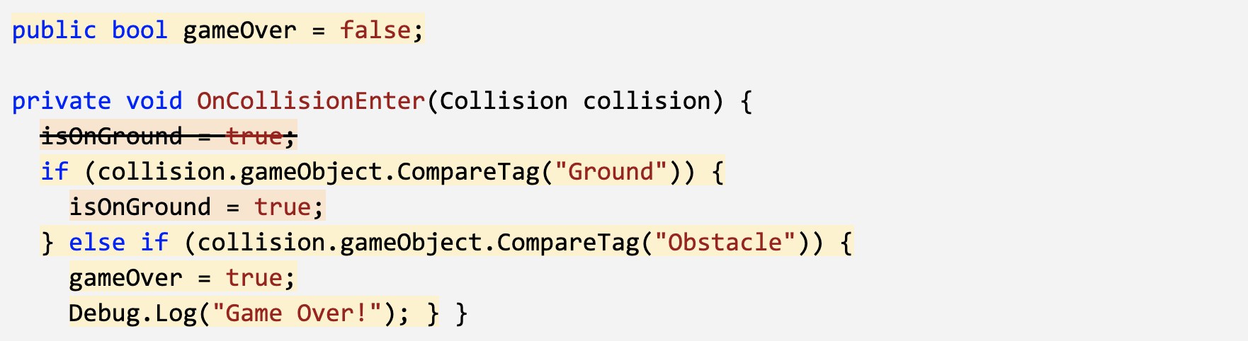 - If they collided with the “Ground”, set isOnGround = true, and if they collide with an “Obstacle”, set gameOver = true