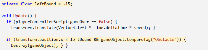 - In MoveLeft, in Update(); write an if-statement to Destroy Obstacles if their position is less than a leftBound variable