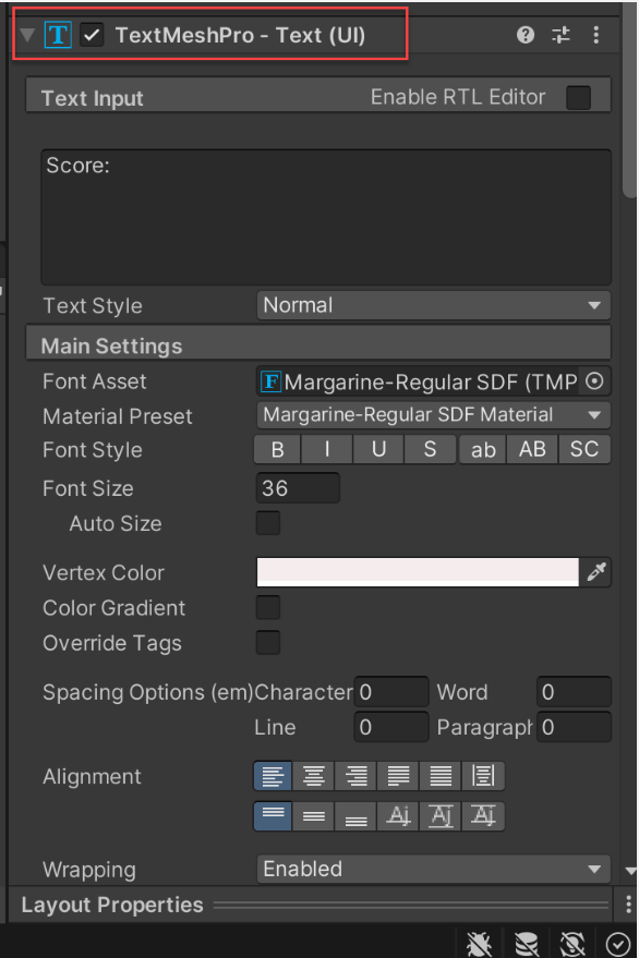 - Choose a Font Asset, Style, Size, and Vertex color to look good with your background
