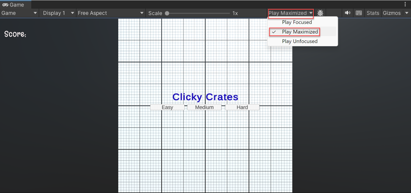Optional: Try playing your game in full screen by going to the dropdown in the upper right of the Game view and selecting Play Maximized.