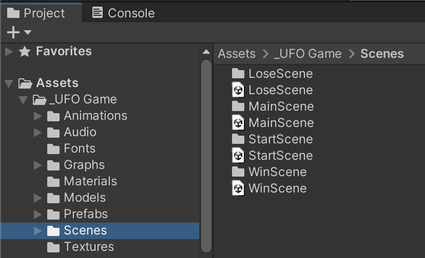 1. From the Project window, go to _UFO Game > Scenes, then open MainScene.