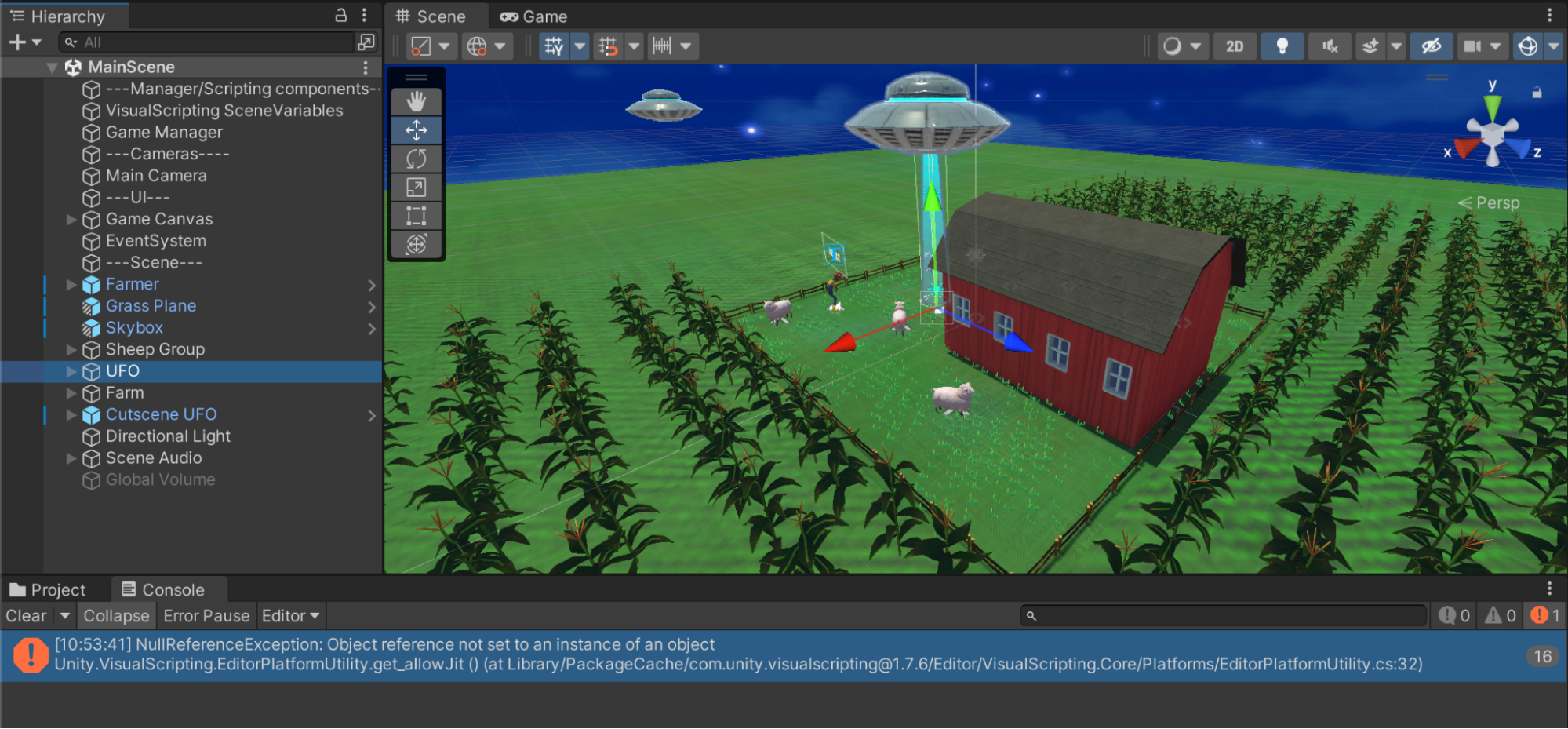 5. Select the UFO, Farmer, or Game Manager GameObjects, all of which contain visual scripts. Check that there are no longer errors appearing in the Console window.