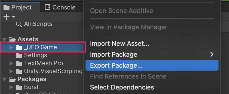 2. In the Project window, right-click the _UFO Game folder, then select Export Package.