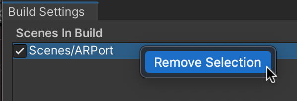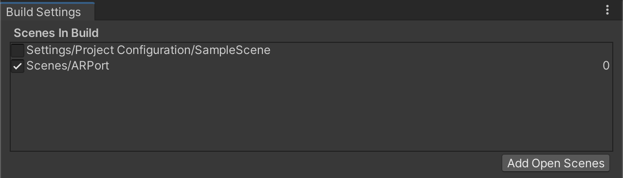 4. In the Scenes in Build section, select Add Open Scenes to add your new ARPort scene to the Scenes in Build list.