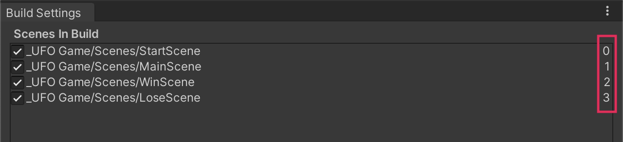 You may remember from the previous Explore the Unity project project tutorial that navigating between the scenes relies on the scenes’ build indices. The build index value for each scene corresponds to the order of the scenes in the Scenes in Build list. For this app to function, the scenes need to be added to the build in the following order: StartScene, MainScene, WinScene, then LoseScene.