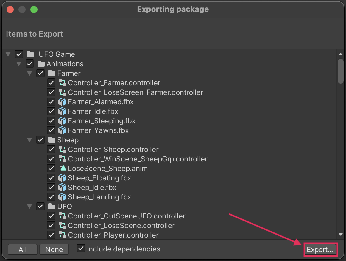 Important: Make sure that you export the _UFO Game folder, and not the entire Assets folder. If you export the entire Assets folder, it will include the project settings which will overwrite the AR project settings.