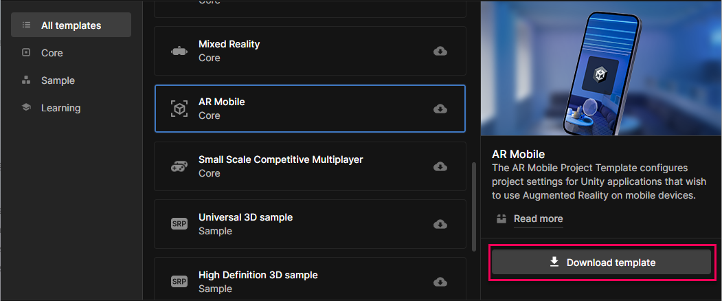 2. Select the AR Mobile Core template from the template list and select the download template button to download the template to your computer.
