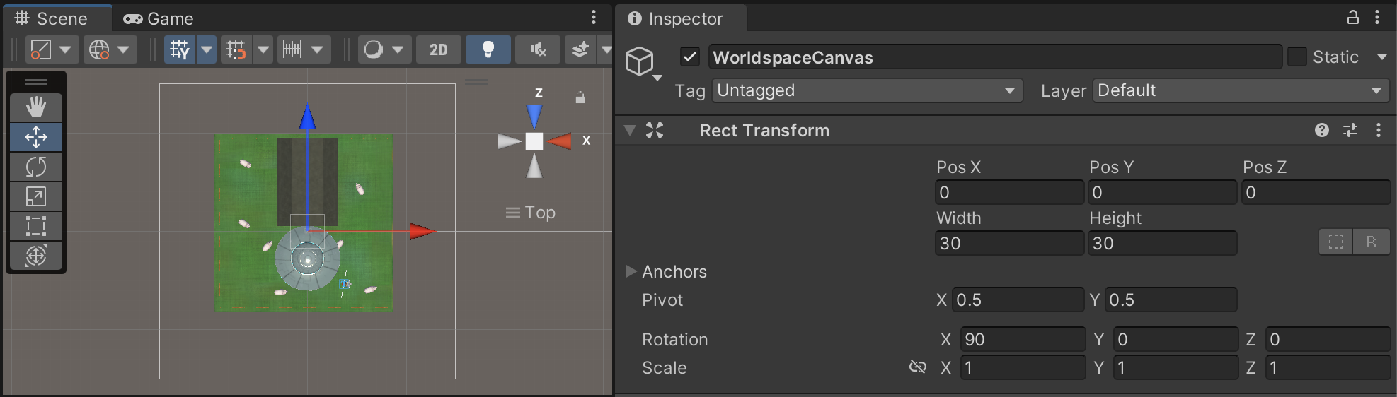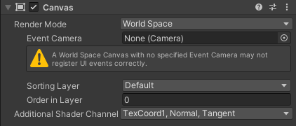 Important: The Inspector window will display a warning that states that a World Space Canvas needs to have an assigned camera to register UI events correctly. This Canvas is part of a prefab, so references to hierarchical cameras will be lost. You’ll need to keep this fact in mind and solve the issue in a script graph as you adjust the game.