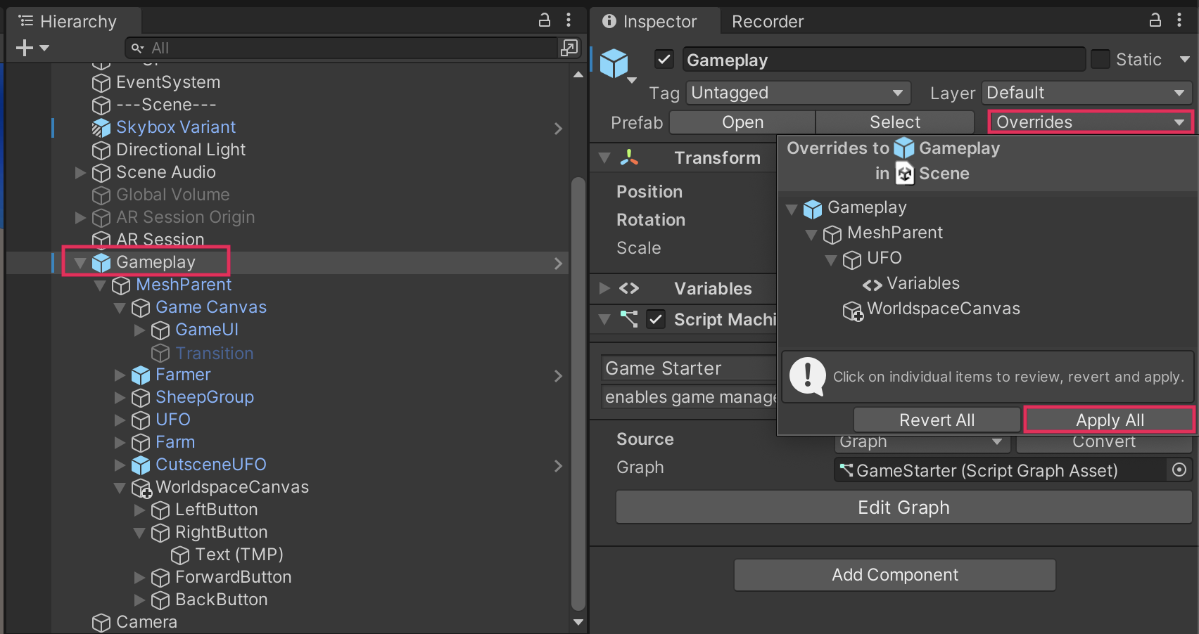 11. To save the changes to the Gameplay prefab, select the Gameplay GameObject, then in the Inspector window select Overrides > Apply All.