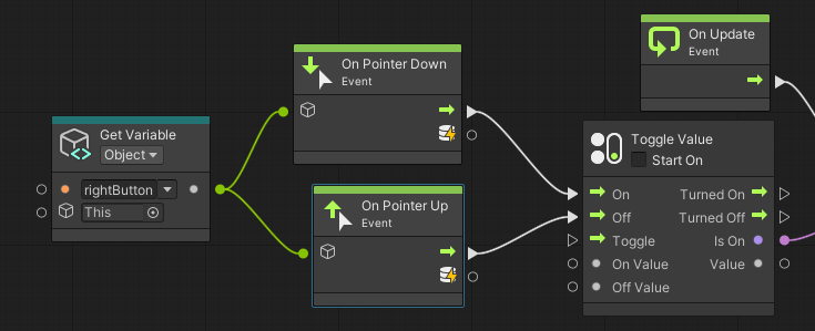 8. Connect the On Pointer Up output to the Off input of the Toggle Value node.